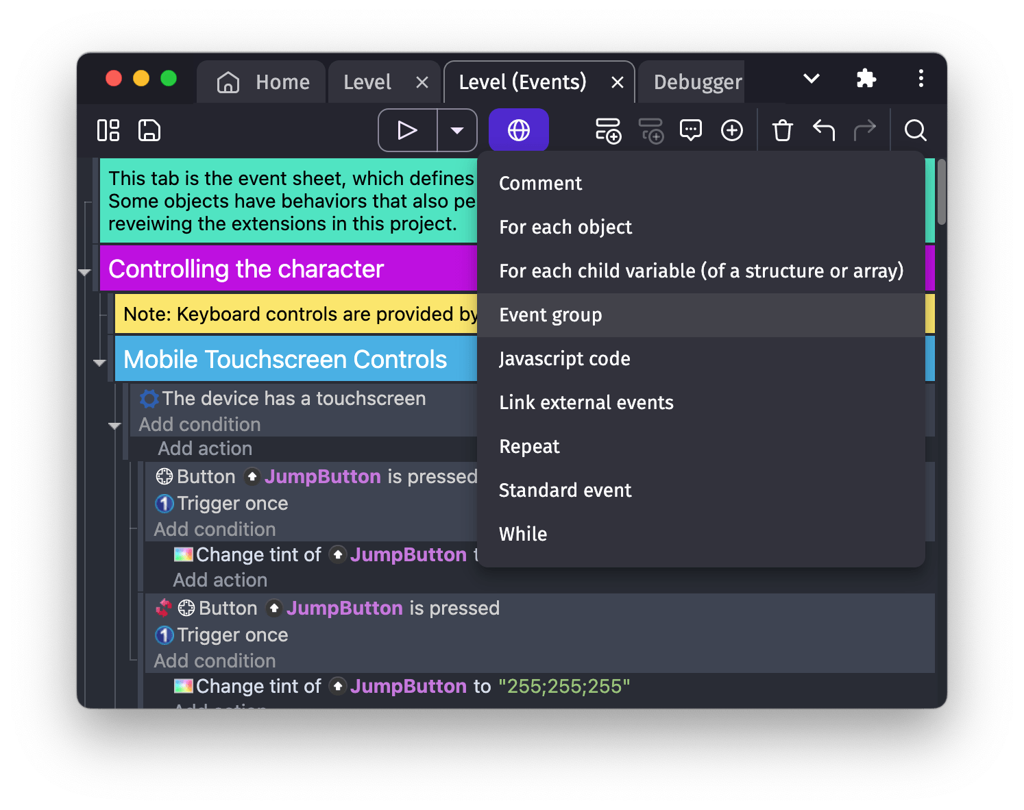 You can add an Event Group by selecting this option in the drop-down menu shown when you click the + button in the Events Sheet toolbar: