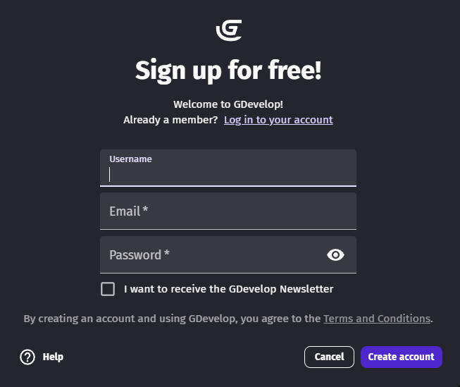 If you don’t have a GDevelop account yet, create one (you just need an email address, a username, and a password).